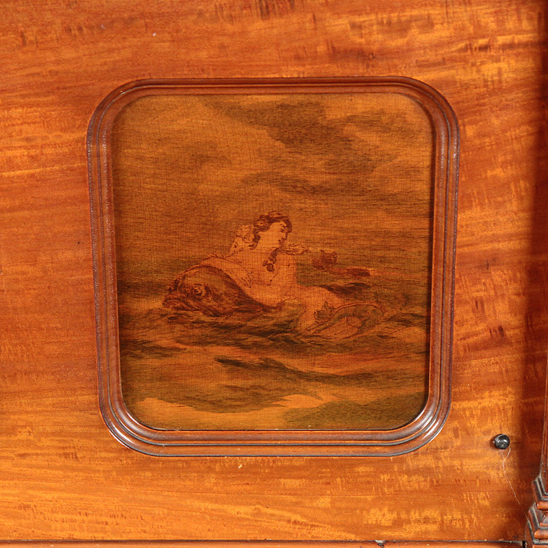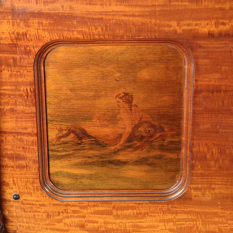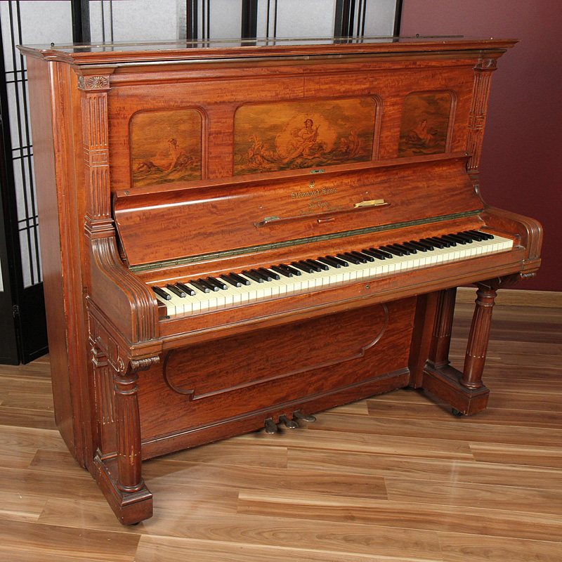This unique and very rare Steinway Upright has a mahogany case with beautiful paintings along the front of the piano. These paintings were actually rendered by Steinway for a private client of Park Ave, NY according to records. The case also has ornate rosettes and fluted columns. Comes with a matching bench.