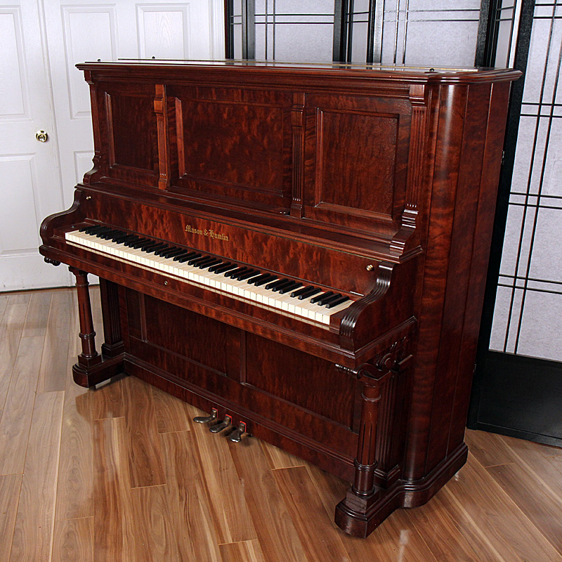 This is a beautiful Mason Hamlin full sized upright piano encased with burled walnut. Comes with the original matching bench. The case has been recently refinished in an open pore stain.
