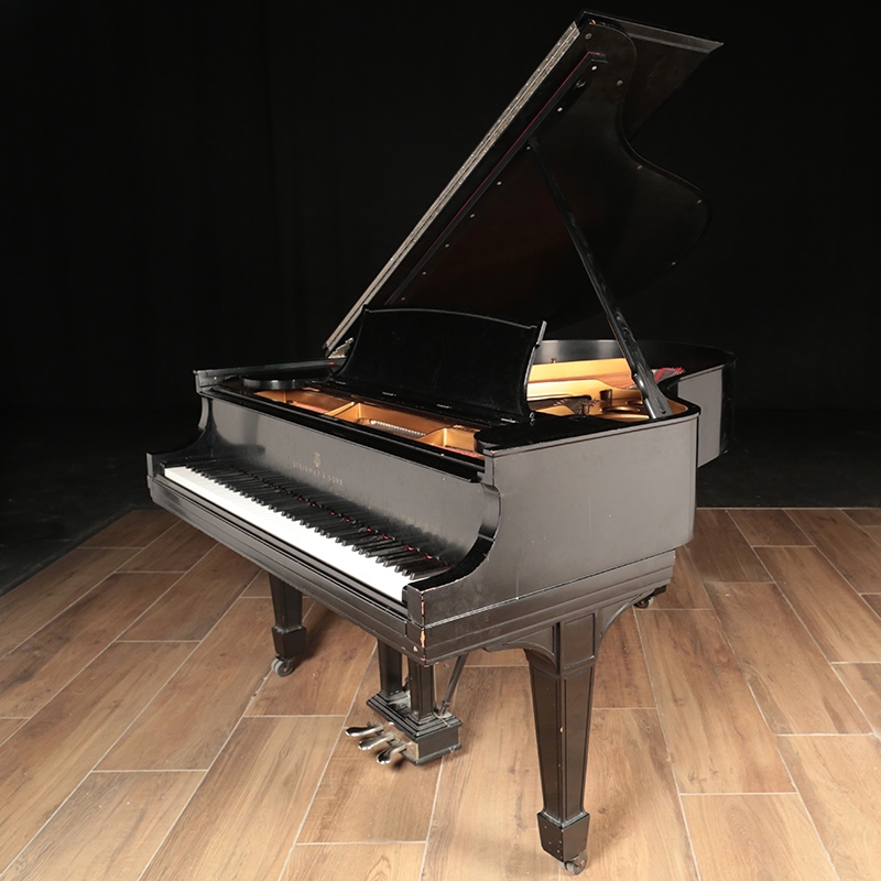 This Steinway Grand has a Traditional case and can be finished in classic Satin Ebony (High Gloss Ebony is available at an additional cost). The action was replaced about 5 years with Renner parts (Steinway Germany). Includes a matching wood top bench.