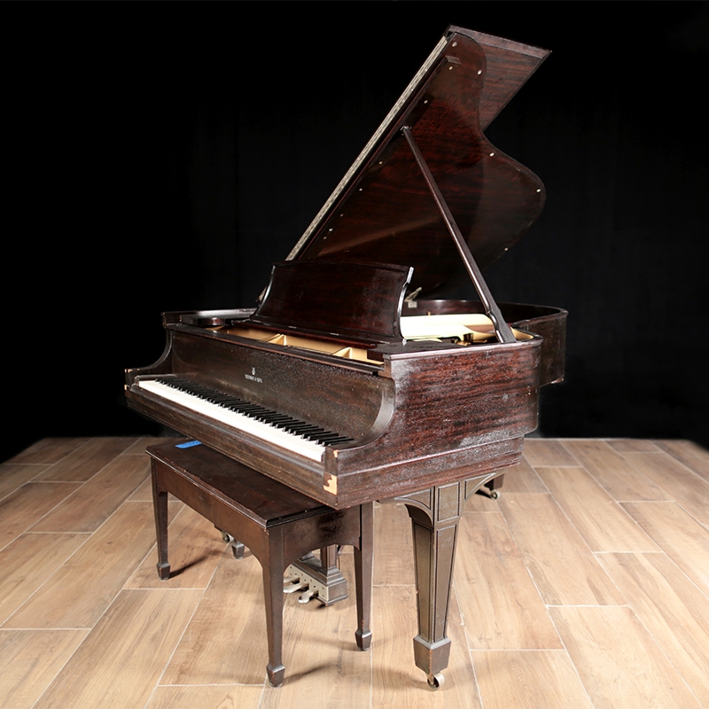 This Steinway Grand Model L is in a classic traditional style case. It will be fully restored using authentic Steinway parts and the case will be refinished in a wood tone stain or ebony satin. The original soundboard is in excellent condition. Includes a matching wood top bench shown.