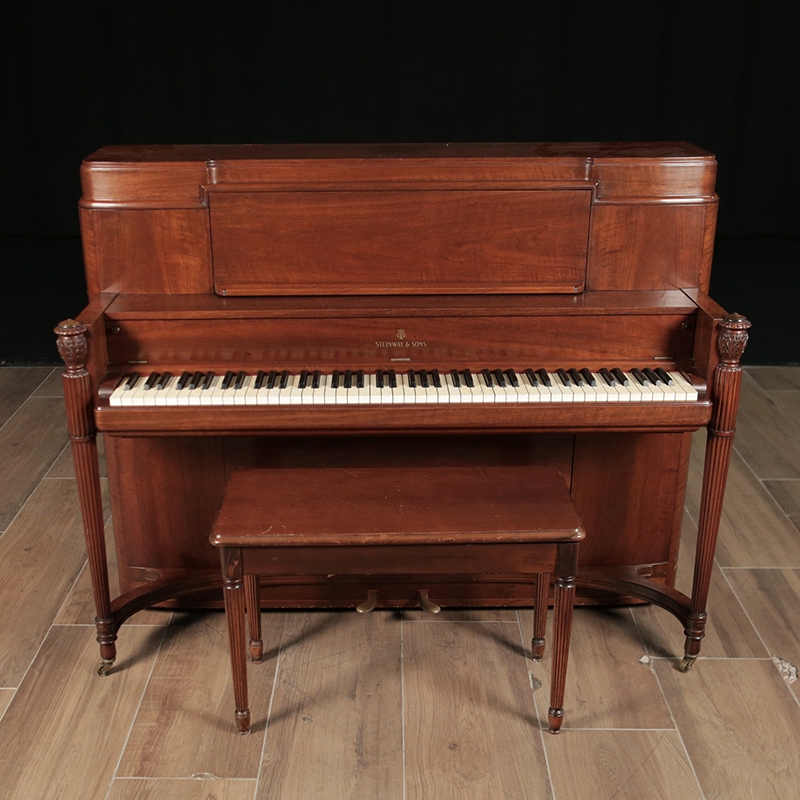 This is a beautiful Steinway studio with a walnut veneer. It will be mechanically restored and refinished in a stain of your choice. Includes the matching bench shown.