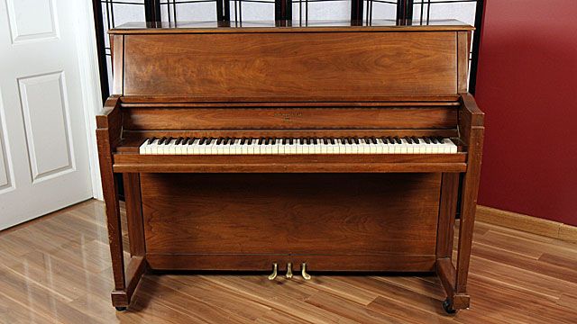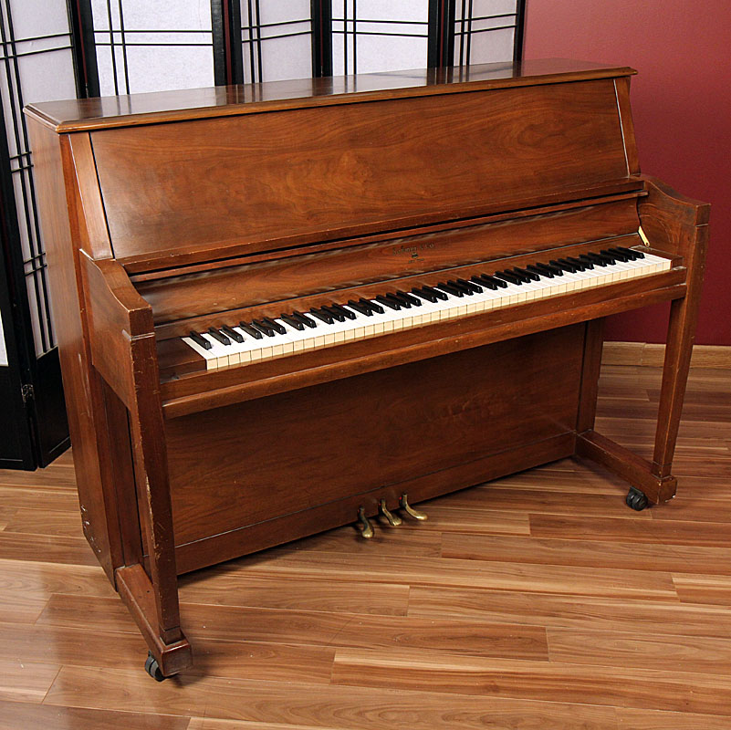 This Sohmer upright comes with a matching bench. The Walnut case will be refinished in a stain of your choice. All the internal parts of the piano are original and in very good condition.