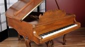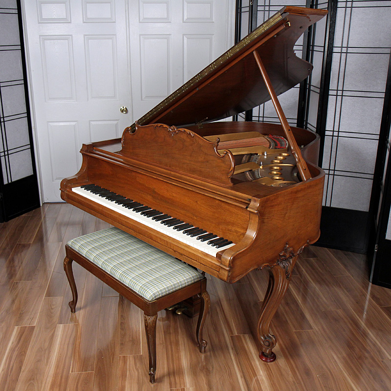Considered by some to be the perfect size piano for any room. This medium sized grand carries the reputation of giving off the deep, rich sound of a larger grand without taking up much room. This rare Louis XV style piano is encased in a elegant walnut cabinet with exquisite carvings. All of the parts are original and in excellent condition. Comes with a matching artist bench.