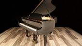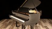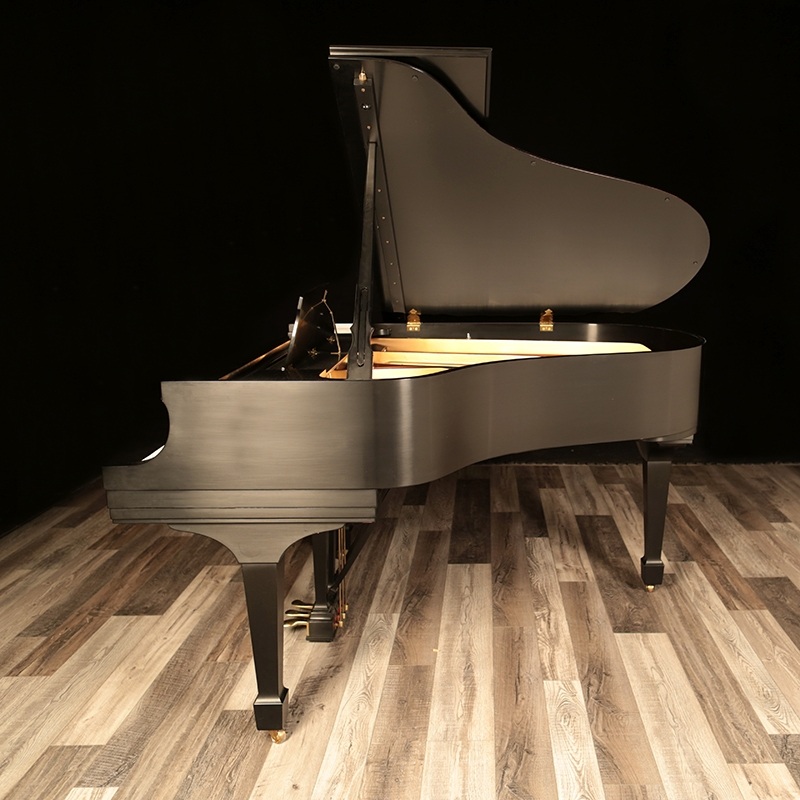 This Steinway Model M is in classic satin ebony and has a traditional case. Includes a matching bench.