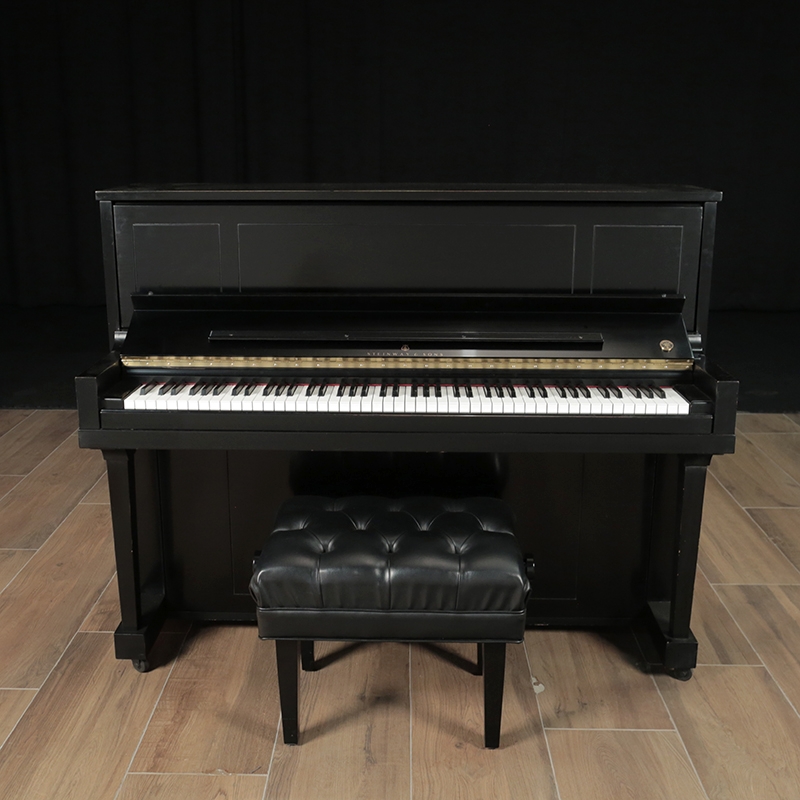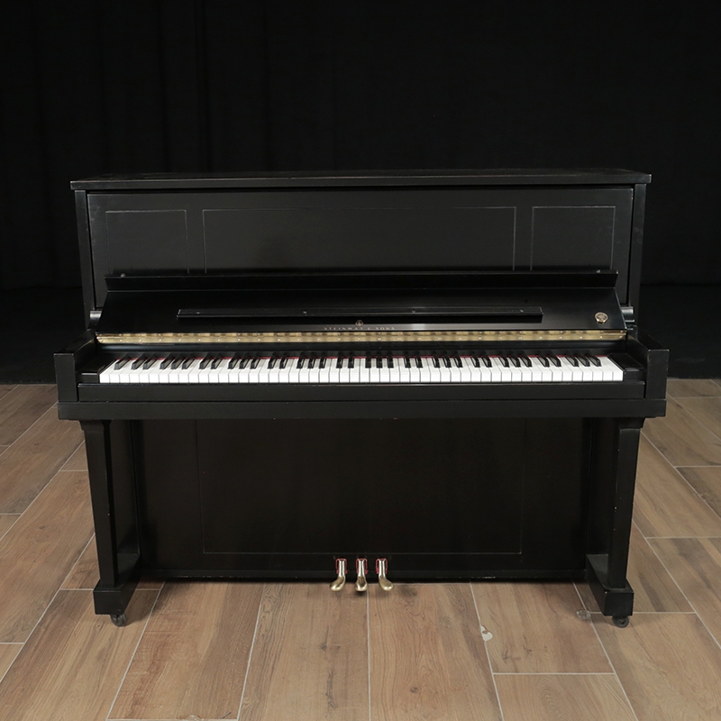 This Model 1098 upright comes with a plague celebrating 150 years of Steinway & Sons pianos. It has a satin ebony finish and all original parts from the Steinway factory. The case can be refinished for an additional cost. Includes a matching artist bench.