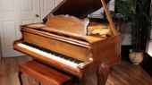 This exquisite Louis XV artcase is a rarity and a masterpiece. In is encased in a walnut finish along with the matching bench. The piano is in very good condition and has been regulated and reconditioned.