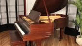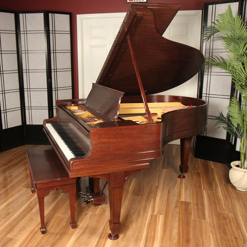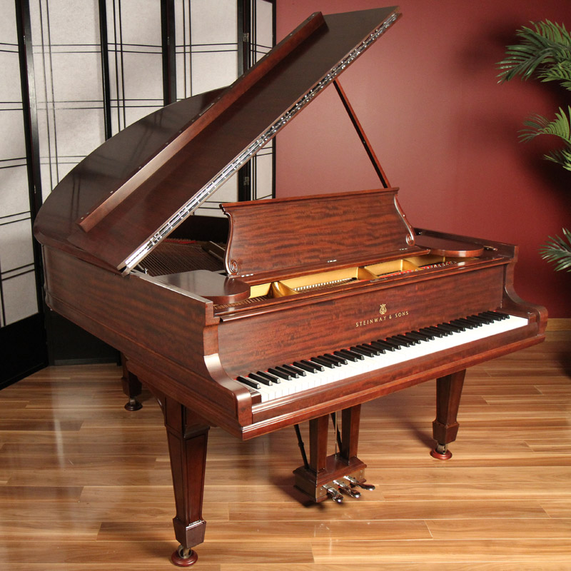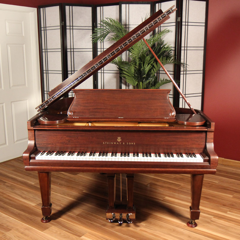 This Steinway O is currently in unrestored condition. It has a beautiful African Mahogany veneer, a set of ivory keys and a matching bench.