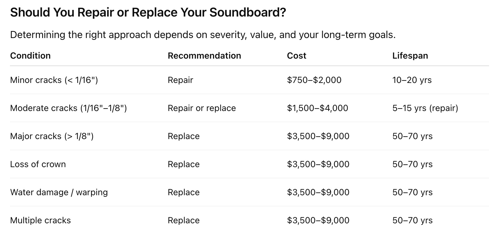 Soundboard replacement typically costs $3,500–$9,000 and becomes necessary when cracks are severe or when the soundboard’s natural curvature (known as the crown) has flattened.