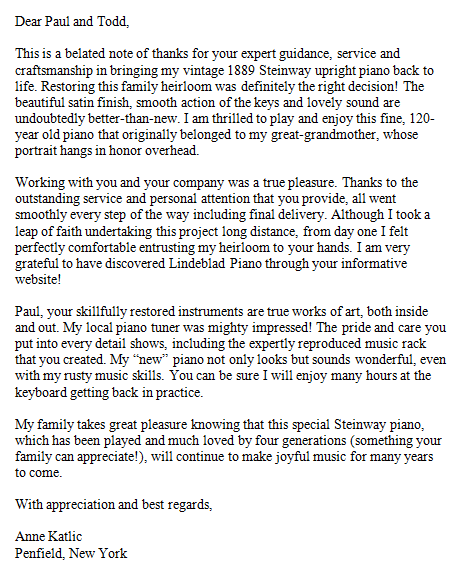 Working with you and your company was a true pleasure. Thanks to the outstanding service and personal attention that you provide, all went smoothly every step of the way including final delivery. Although I took a leap of faith undertaking this project long-distance, from day one I felt perfectly comfortable entrusting my heirloom to your hands. I am very grateful to have discovered Lindeblad Piano through your informative website!