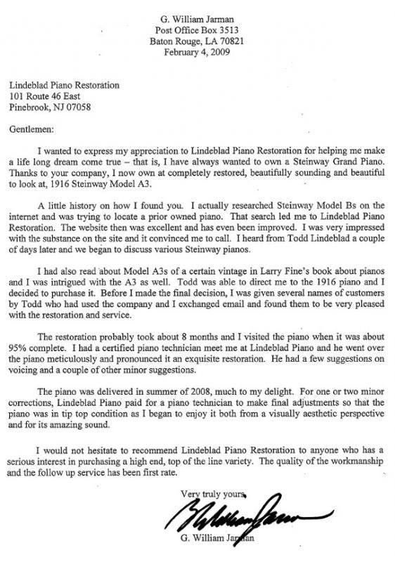 I wanted to express my appreciation the Lindeblad Piano Restoration for helping me make a life long dream come true--that is, I have always wanted to own a Steinway Grand Piano. Thanks to your company, I now own at completely resorted, beautifully sounding and beautiful to look at, 1916 Steinway Model A3.