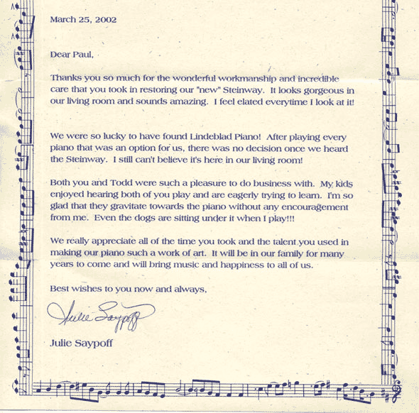 Thank you so much for the wonderful workmanship and incredible care that you took in restoring our new Steinway. It looks gorgeous in our living room and sounds amazing. I feel elated every time I look at it!