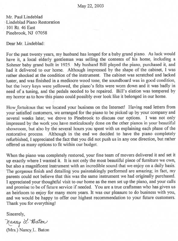 How fortuitous that we located your business on the Internet! Having read letters from your satisfied customers, we arranged for the piano to be picked up by your company and several weeks later, we drove to Pinebrook to discuss our options. I was not only impressed by the work you have meticulously done on the other pianos in your beautiful showroom, but also by the several hours you spent with us explaining each phase of the restorative process. Although in the end we decided to have the piano completely refurbished, I appreciated the fact that you did not push us in any one direction, but rather offered us many options to fit within our budget.