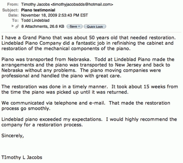 I have a grand piano that was about 50 years old that needed restoration. Lindeblad Piano Company did a fantastic job in refinishing the cabinet and restoration of the mechanical components of the piano.